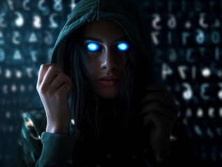 Female hacker browsing the web anonymously in a dark setting with only her eyes visible