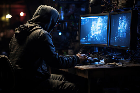 A focused individual in a hoodie works on a computer in a dark room, evoking themes of cybersecurity.