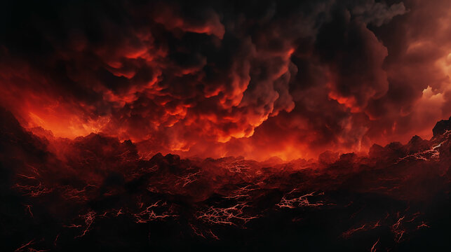 Black fiery red dramatic sky with clouds. Fire, war, explosion, catastrophe, flame. Horror concept. Web banner. Wide bloody red background with space for design. Panoramic. made with generative ai
