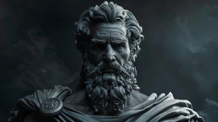 Marble statue: the powerful and merciless god of the underworld of the dead Hades on the throne reading Book of the Dead. Ancient Roman and Greek mythology.