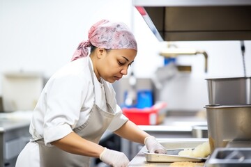 employee with hairnet preparing food on stainless counter