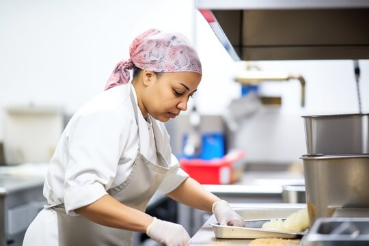 Food Worker Wearing a Hairnet and Gloves for Safety