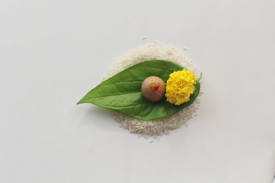 Betel Leaf, Areca nut, Rice, Kumkum & Turmeric, for puja or wedding ceremony. India