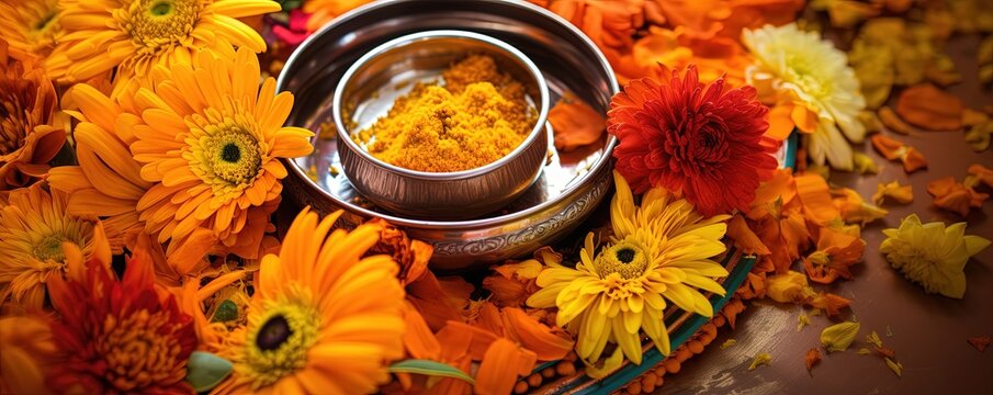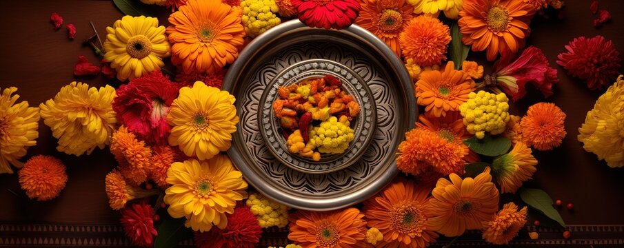 Vibrant Marigold Flowers Surrounding a Traditional Indian Thali