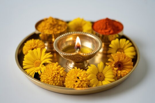 A brass plate holds a lit diya, surrounded by yellow flowers and bowls of turmeric and kumkum powder, on a white background