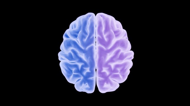 Abstract illustration of a human brain, split into two halves with vibrant blue and purple colors, representing creativity and logic, set against a black background for visual impact