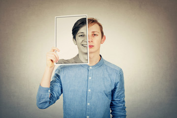 False portrait of a sad boy teenager hiding half face using a photo print paper sheet with a fake happy emotion. Mask for hiding the real expression, create new fake identity, grey wall background.