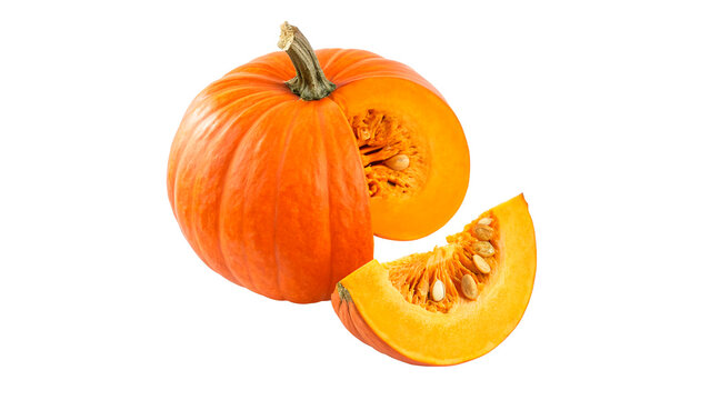 A vibrant close-up of a freshly cut orange half, showcasing its juicy segments and visible seeds against a bright white background.