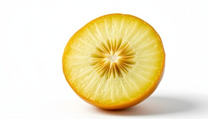 a high resolution, photorealistic honeydew half with visible seeds isolated on a clean white background
