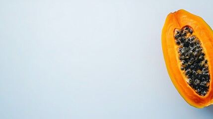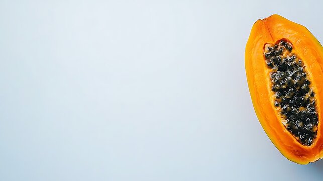 A papaya split in half, with its bright orange flesh and visible seeds against a pure white background, offering a clear view of the tropical fruit's interior