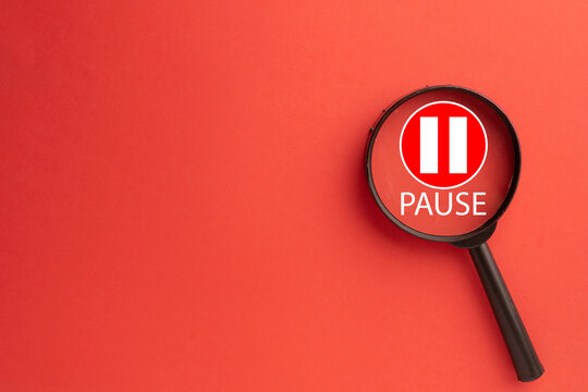 Magnifying glass focusing on a red pause button icon with white bars and 'PAUSE' text.Concept of taking a break,stopping for reflection, work hiatus,analyzing an interruption,or media player control.