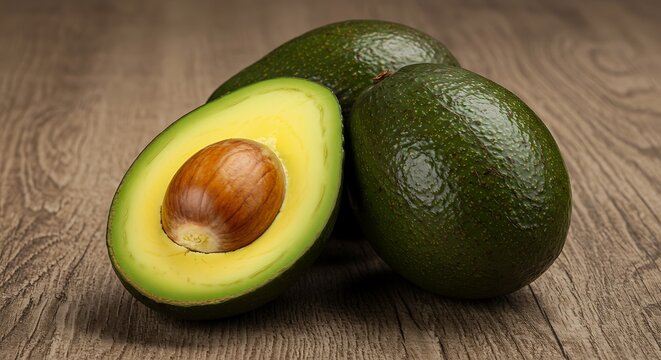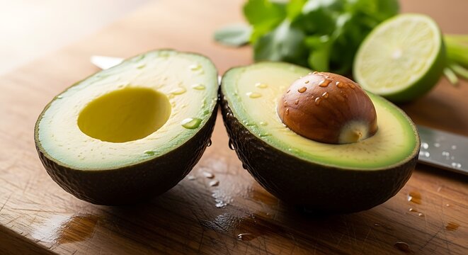 halved avocado with seed spinach on wooden board showing vibrant greens and textured surfaces