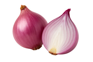 A perfectly halved red onion with its layers visible, alongside a whole red onion, both set against a stark transparent background.