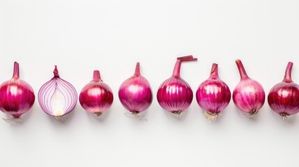 Set of red onion whole bulbs and pieces isolated on transparent background,Set of red onion slices,top view,Fresh red onion and cut in various size,png,Sliced red onions png,full depth of field,Ai