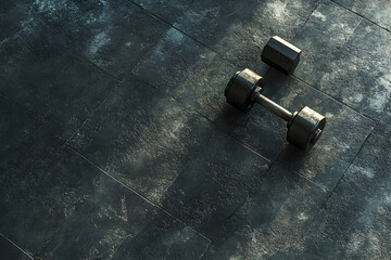 Minimalist gym scene: old iron dumbbells resting on a textured concrete floor, ready for action