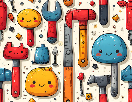 A hammer and nails arranged in a symmetrical pattern on a wooden board, casting intricate shadows in soft, warm light