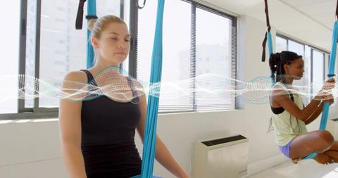 Practicing aerial yoga on blue silk hammocks in bright studio with two women meditating