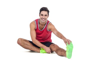 High-angle view of the hands of a man, touching his toes from sitting position as a stretching exercise for flexibility at home or at the gym
