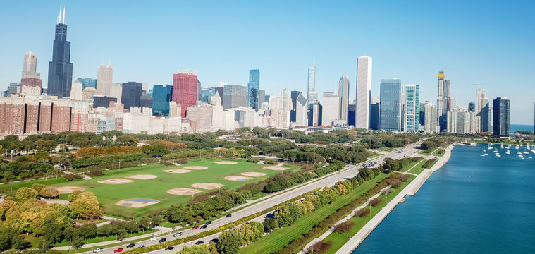 Chicago/ USA-14th May 2010: Beatiful horizontal view of Chicago's down town showing many skyscrapers and tall building. However, we still see the green and trees from the park and people activites.