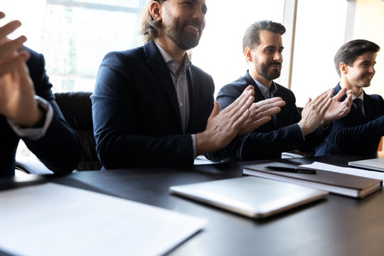 Close up view of business seminar listeners clapping hands. Professional education, work meeting, presentation or coaching concept.Horizontal,blurred background.