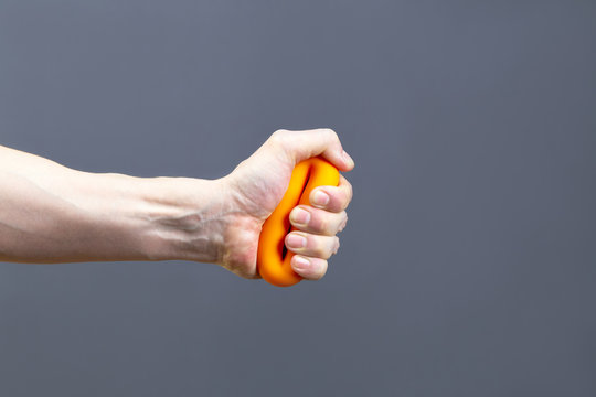 Hand exercising, squeezing a handgrip, man gripping hand exercise gripper.