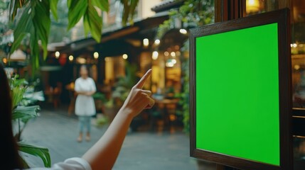 Hand pointing at green screen outside on a sunny day.