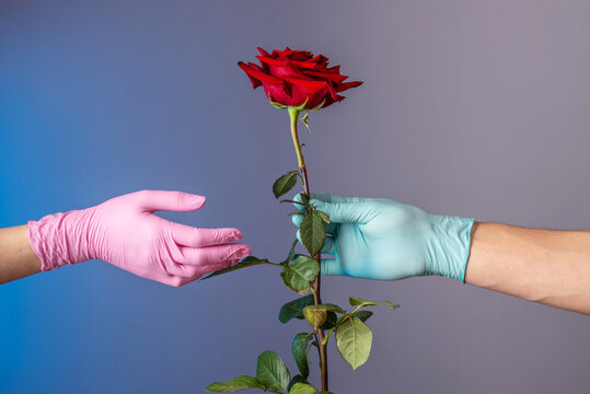 A man's hand in a blue glove is giving a red rose to a woman's hand in pink glove on a blue and gray background. Concept of a lifestyle in a pandemic