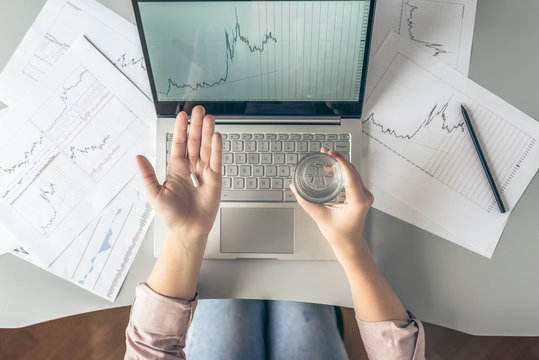 Hand Holding Tablet With Digital Business Graphics And Charts Images