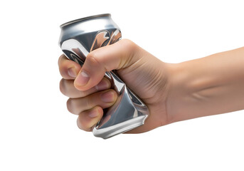 A powerful hand crushing and squeezing a silver aluminum beverage can for recycling. Isolated on transparent background, png