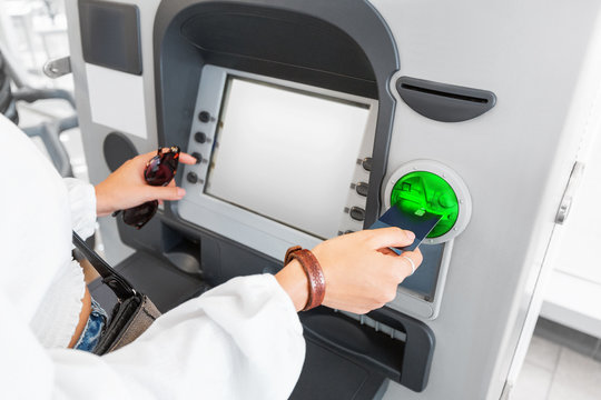 Atm money cash machine. Woman withdraw money bill. Holding american hundred dollar cash. Bank credit card, us dollar.
