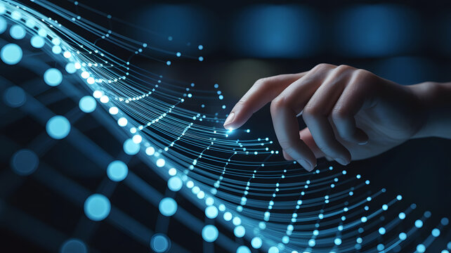 Close up of a human hand interacting with a glowing blue digital network of data points and lines