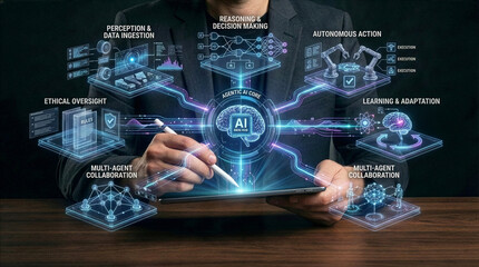 Businessman interacting with ai hologram in office, Concept of artificial intelligence, chatbot, virtual assistant, and generative AI technology.