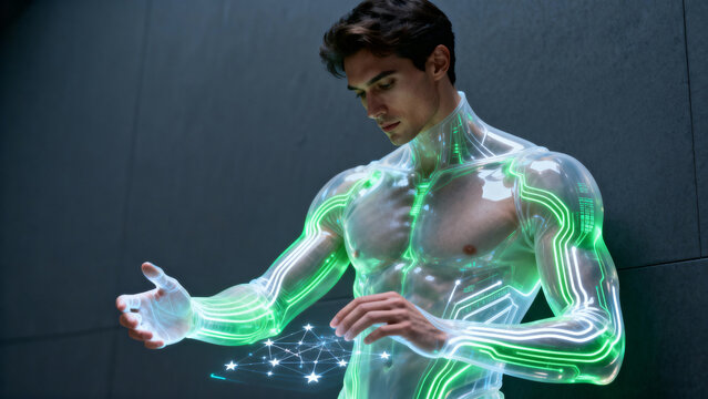 A futuristic man with a translucent bionic body and glowing green circuits interacts with a digital network. A concept of human enhancement and future technology.