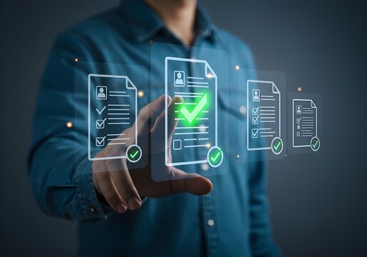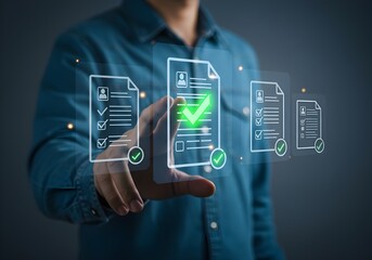 Hand Interacting with Futuristic Holographic Interface with Green Approval Checkmarks