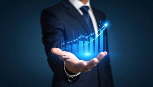 A man in a suit has one hand outstretched against a dark background, with a glowing, rising blue line chart on his hand