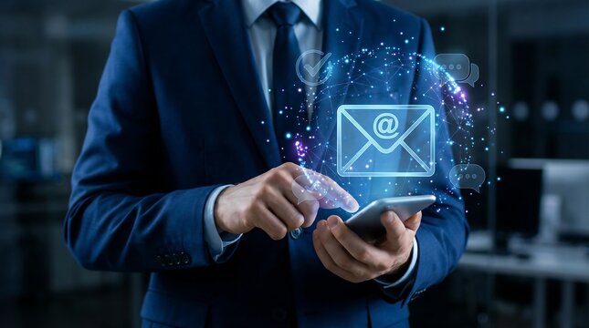 Businessman s outstretched hand displaying a glowing futuristic digital interface with financial charts and technology icons representing global data analytics and innovation