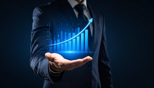A man in a suit has one hand outstretched against a dark background, with a glowing, rising blue line chart on his hand