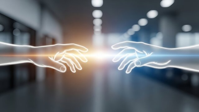Technology Exploration: A person intently interacts with a futuristic, ethereal display, their outstretched hand connected to the complex visual data.