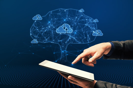 Cloud technology concept. Computing data storage. Software infrastructure. Hand pressing button.