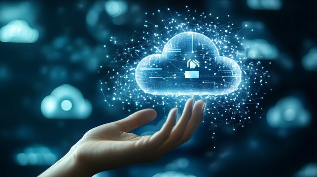 Digital cloud computing technology hand holding network data web blue dark lines server global future