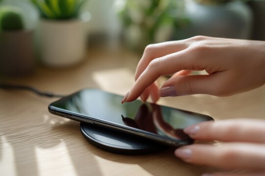 Close-Up of Hand Reaching for Smart Phone on Wireless Charger with Green Plants in Background