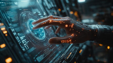 Hand Interacting With Futuristic Digital Interfaces