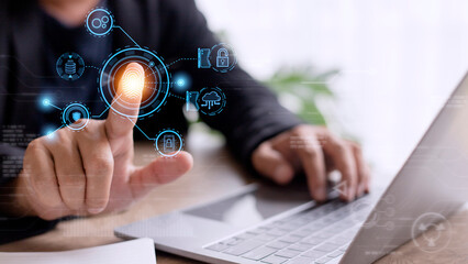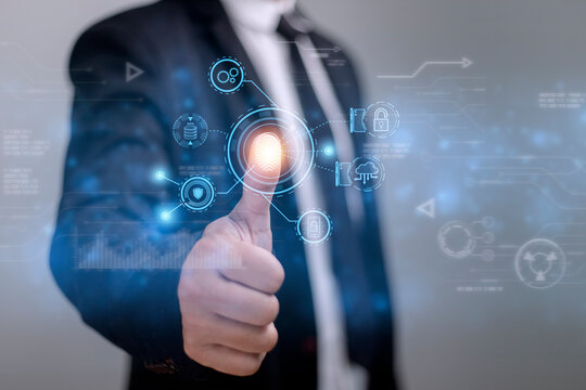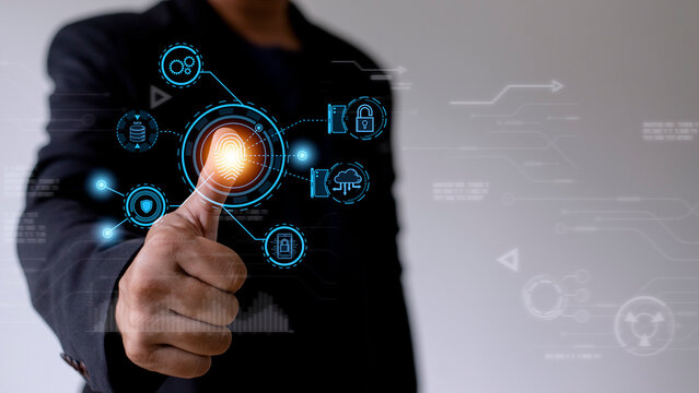 Technology fingerprint scan provides security. digital transformation change management,new technology big data and business process strategy, automate operation, customer service management.