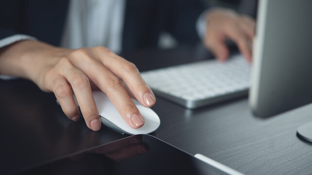 Closeup, Woman hand clicking computer mouse on office table. Business woman working on desktop computer and using wireless mouse, browsing the internet, searching the information, business background