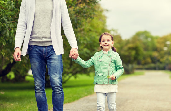 Father and daughter walking hand-in-hand on sunlit autumn trail with golden leaves