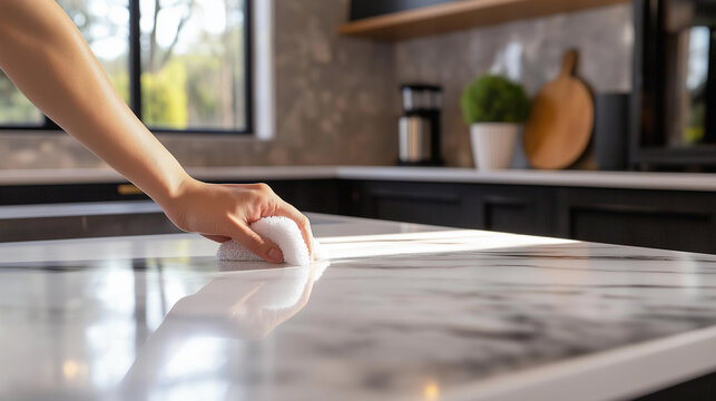 Hand wiping down a marble kitchen counter with sunlight streaming in