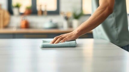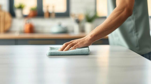 A hand wiping a countertop with a cloth, crisp details, balanced frame with copy space on the left, modern ad aesthetic.