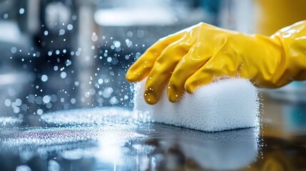 Employee hand in rubber protective glove with microfiber rag wiping blue table, wall or floor surface in room, bathroom, kitchen. Early spring or regular cleanup. Commercial cleaning company concept.