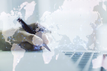 Double exposure of abstract digital world map and hand writing in notepad on background with laptop, big data and blockchain concept