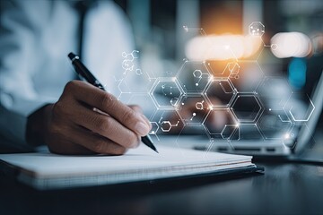 Close-up of person writing notes with a pen, laptop in background, abstract hexagonal shapes